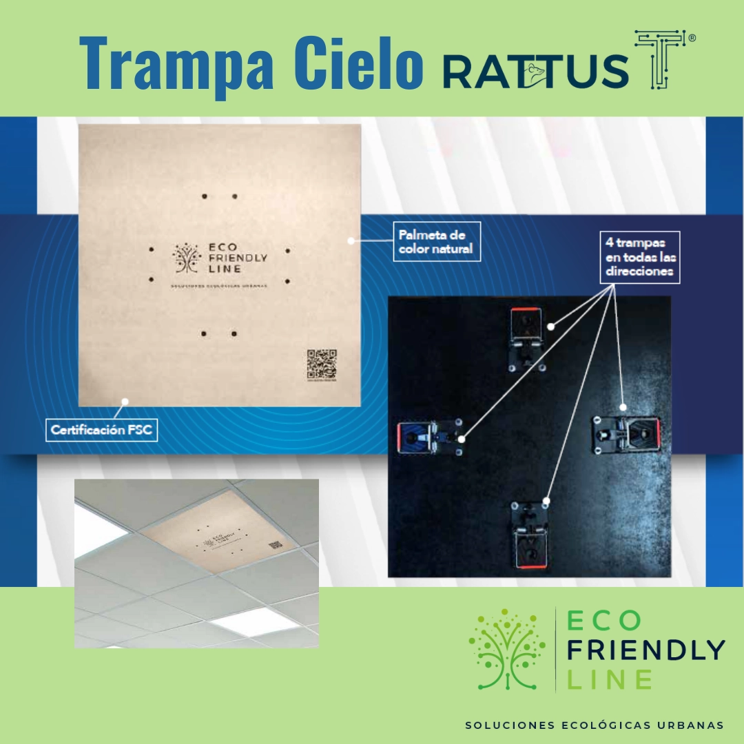 Rattus®, es una trampa especialmente diseñada para usar en cielos falsos, es un tablero de madera natural cortado a la medida como una palmeta de cielo falso de tamaño estandar.